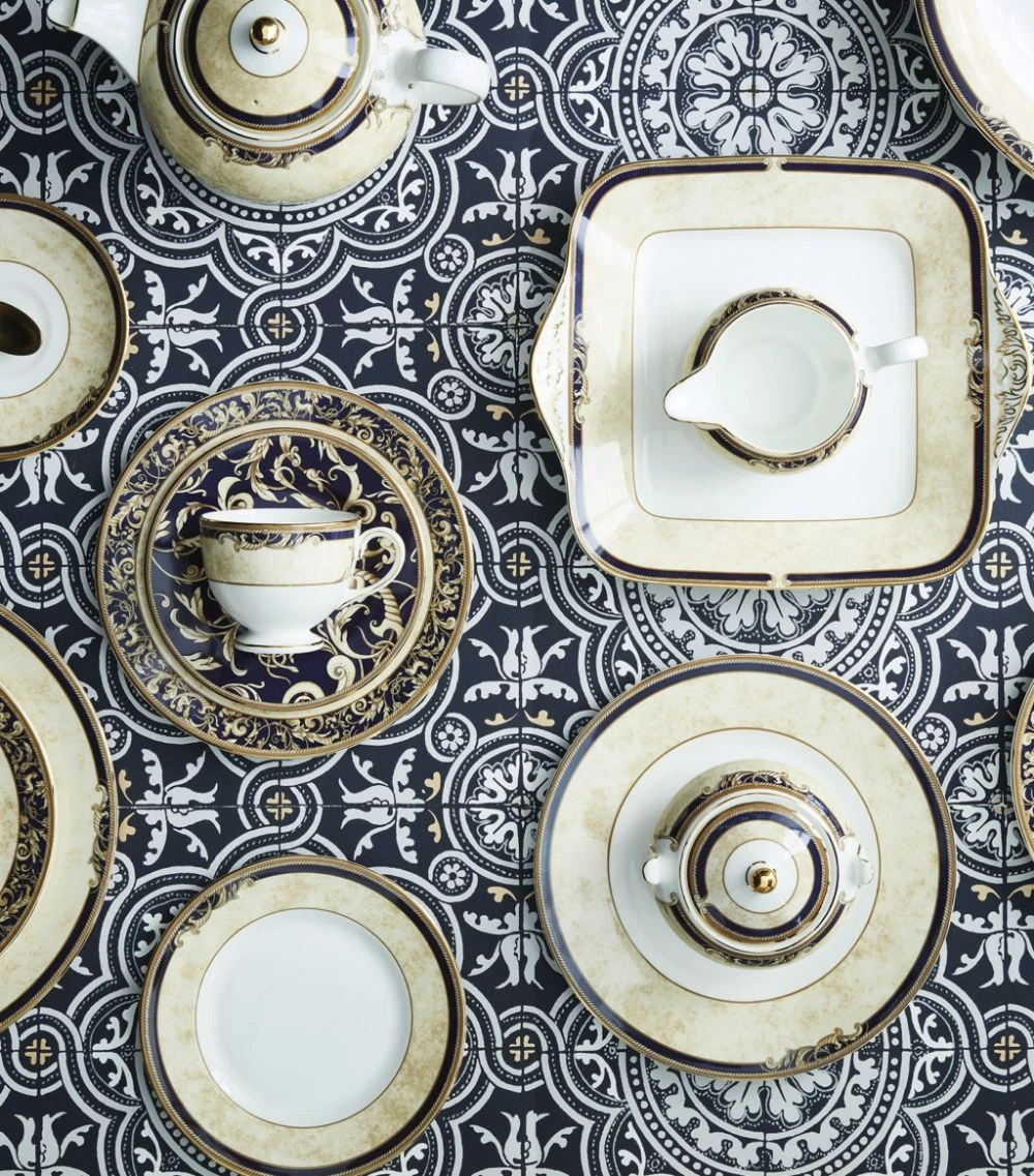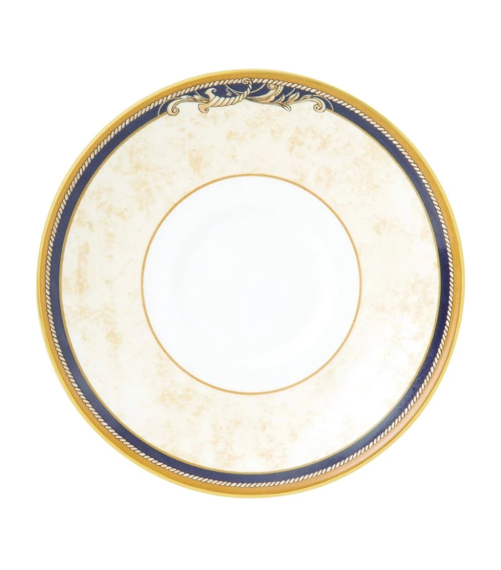Inspired by the mythical ‘Horn of Plenty’, Wedgwood’s Cornucopia collection is an elegant choice for formal table settings. This fine bone china tea saucer is decorated with a wide band of ivory parchment, ribboned by deep navy, roped with an ochre accent and rimmed in lustrous 22-karat gold for an extra-special finish.