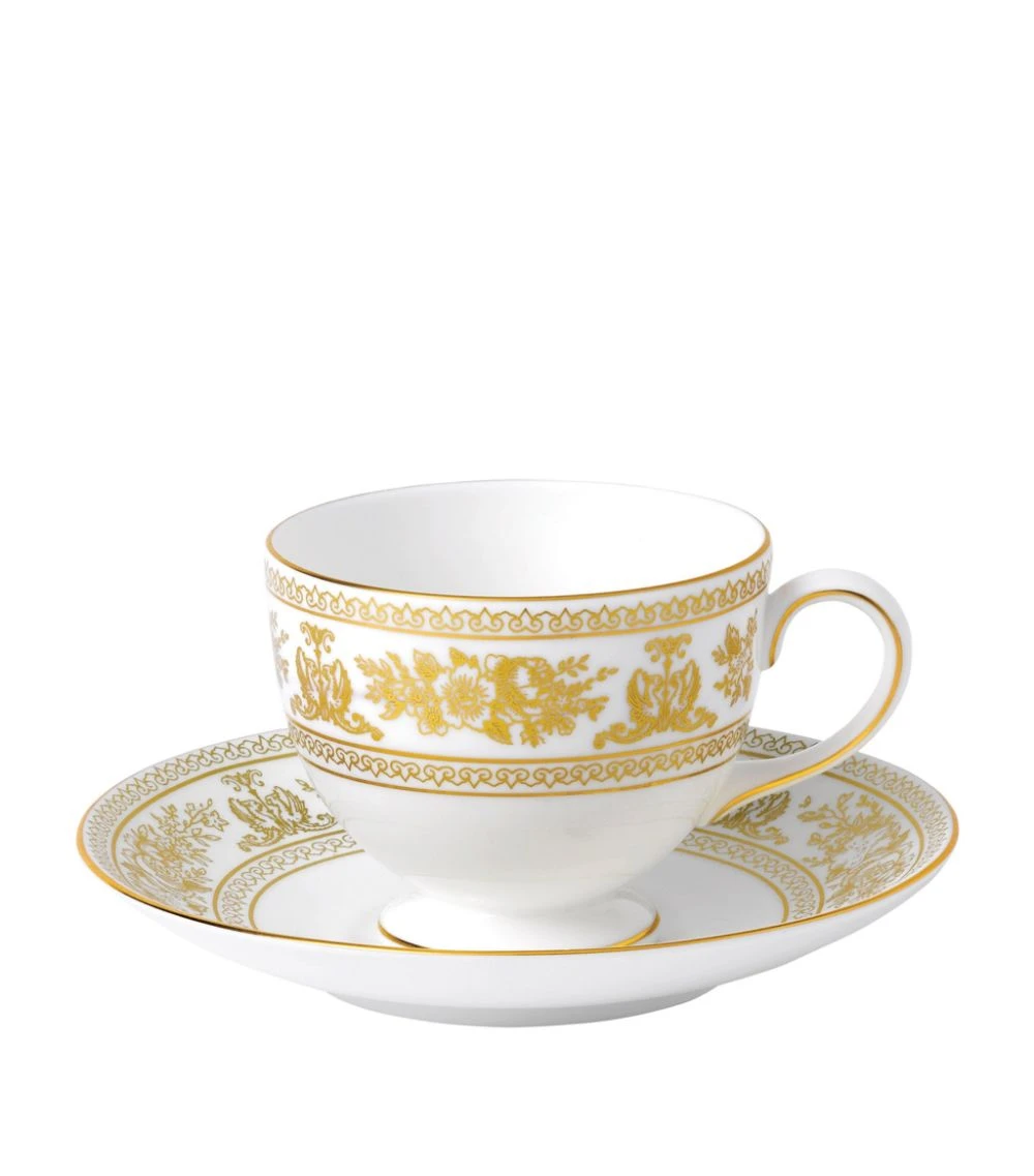 Wedgwood’s Gold Columbia pattern – originally created by Thomas Allen in 1880 – offers an enchanting array of mythological motifs and quintessentially English florals, blending together in a sophisticated design. It is transferred here onto a dainty china cup and saucer with precious hand-lined, 22 karat gold, transforming your afternoon tea time into an affair of unquestionable luxury.