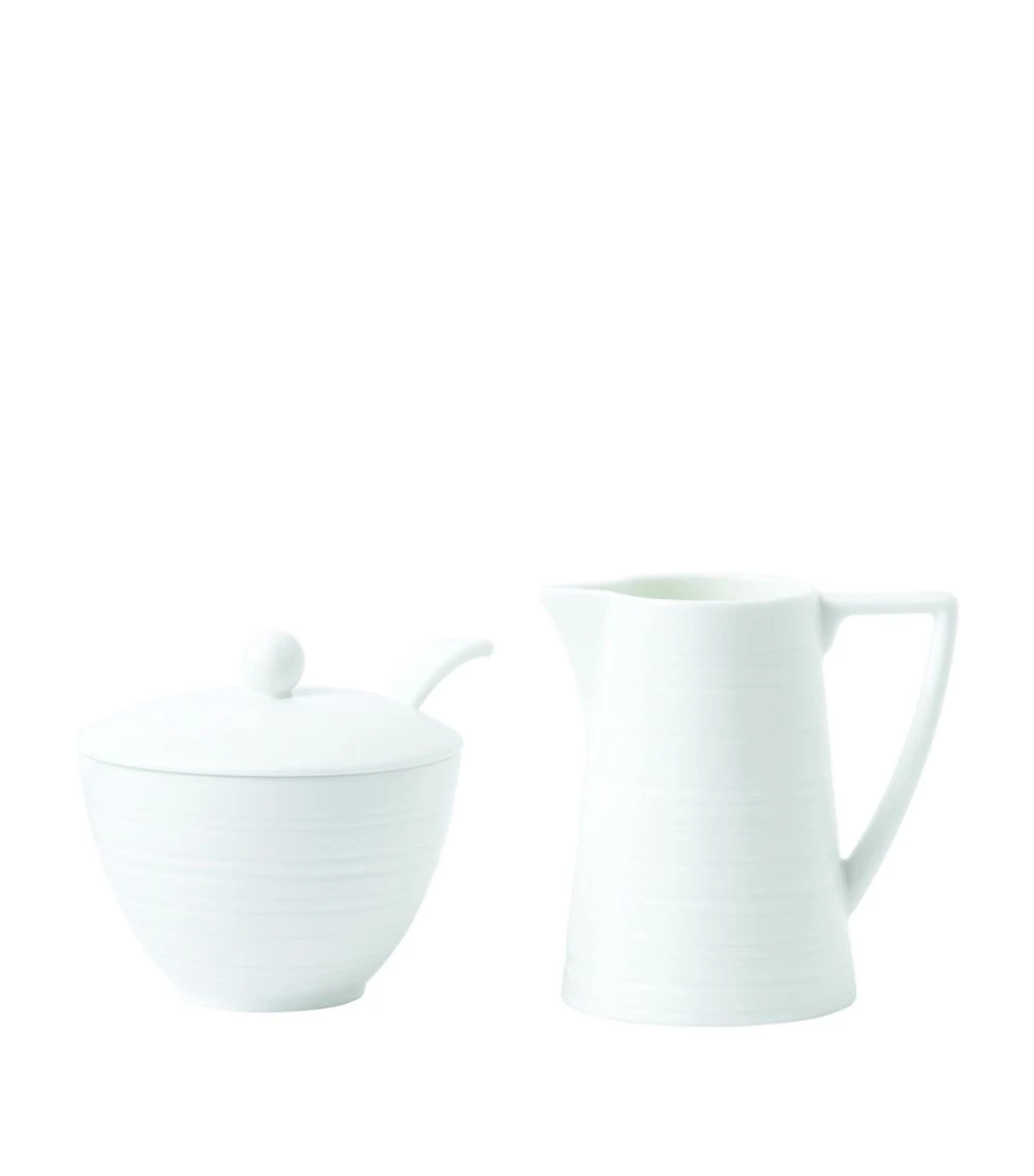 Crafted from fine bone china and delicately embossed with a radial design, this cream and sugar spoon set formspart of the Jasper Conran Strata collection for Wedgwood. Ideal for light lunch occasions.