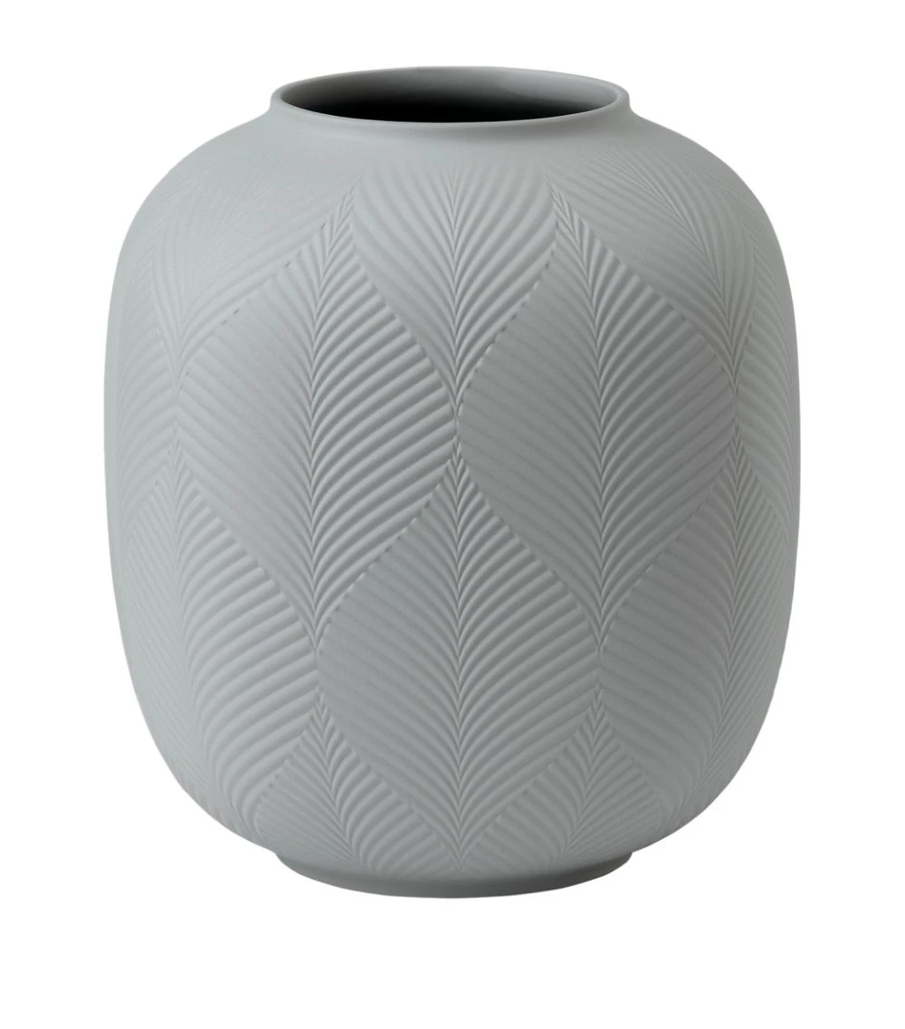 Intricate Folia patterning depicts tonal leaf-like embellishments across this vase.