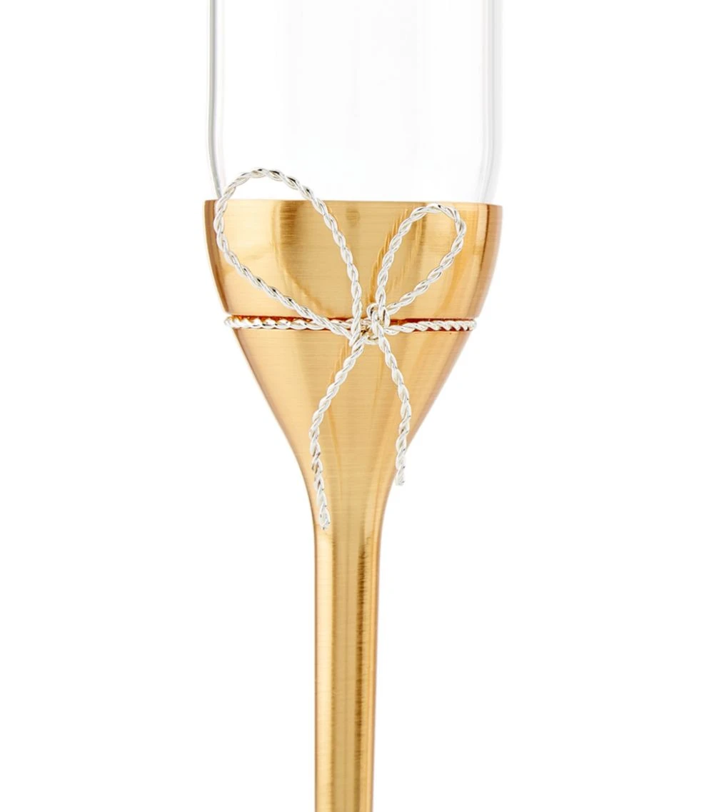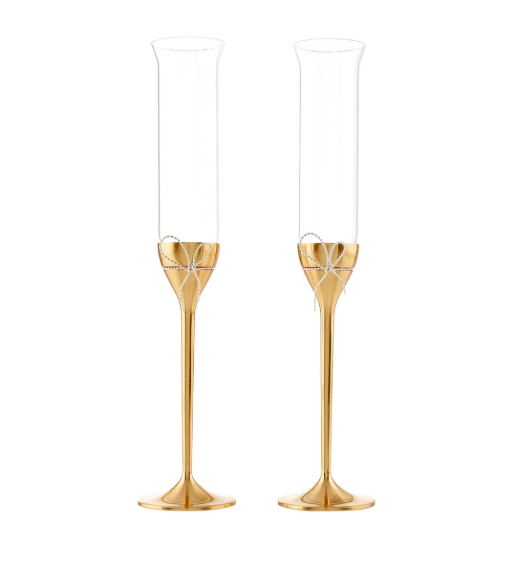 Raise a toast to the special occasion with these elegant flutes from Vera Wang’s collection for Wedgwood. Capturing Yes romance in silver-plating with a gold-tone finish and silver love-knots, they’re perfect as a sophisticated wedding gift.