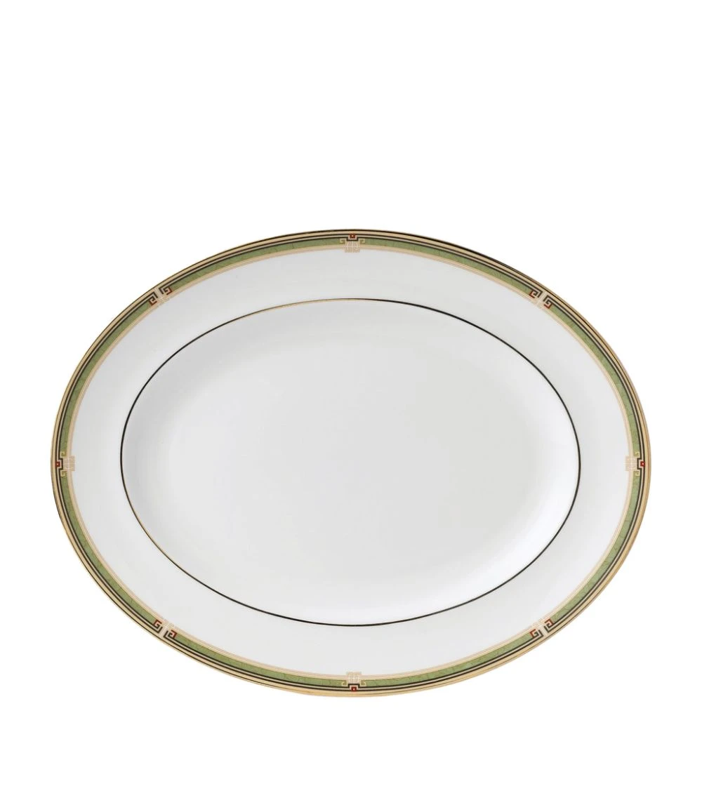 Wedgwood’s enchanting Oberon dinnerware collection is characterised by timeless elegance and modern style. Rimmed with lustrous 22-karat gold plating and an ornate chinoiserie border featuring vine motifs and bursts of flora, this oval platter makes a stately addition to your tableware.
