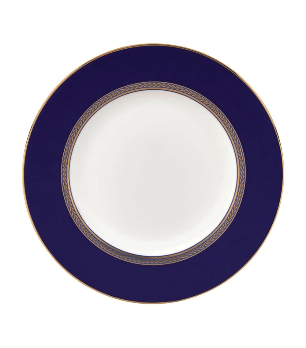 Wedgwood calls on its extensive archives to create the regal Wedgwood Regency Gold tableware collection. Crafted in exquisite fine bone china, the set offers modern simplicity with rich navy accents and oval motifs inspired by the iconic Wedgwood cameo. This plate serves as an understated addition to the table with its navy band and lustrous gold detailing.