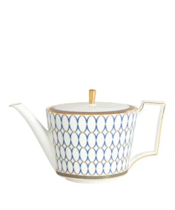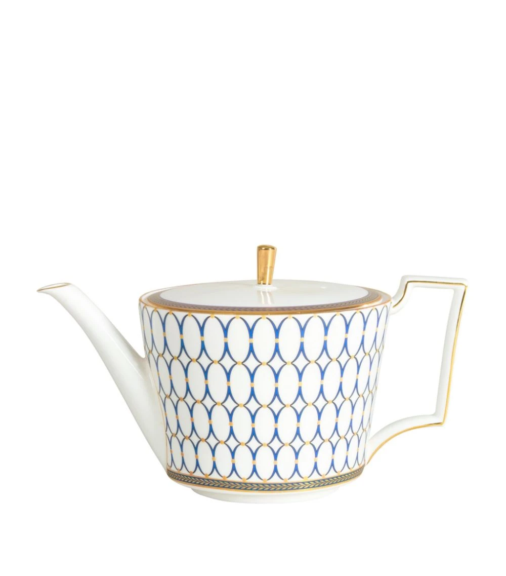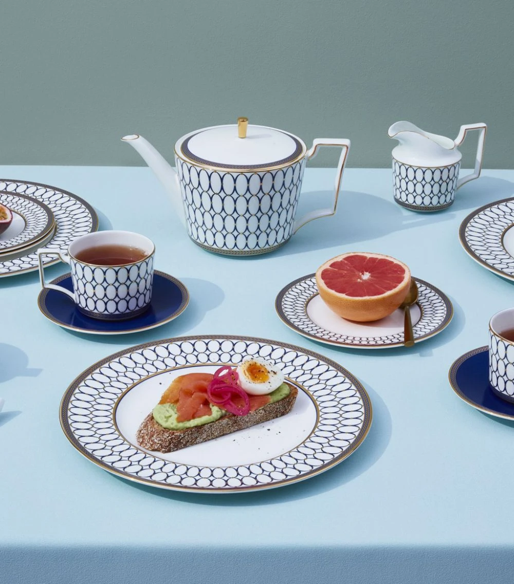 Wedgwood calls on its extensive archives to create the regal Wedgwood Regency Gold tableware collection. Crafted in exquisite fine bone china, the set offers modern simplicity with rich navy accents and oval motifs inspired by the iconic Wedgwood cameo. This teapot serves as an understated addition to the table with its navy pattern and lustrous gold detailing.