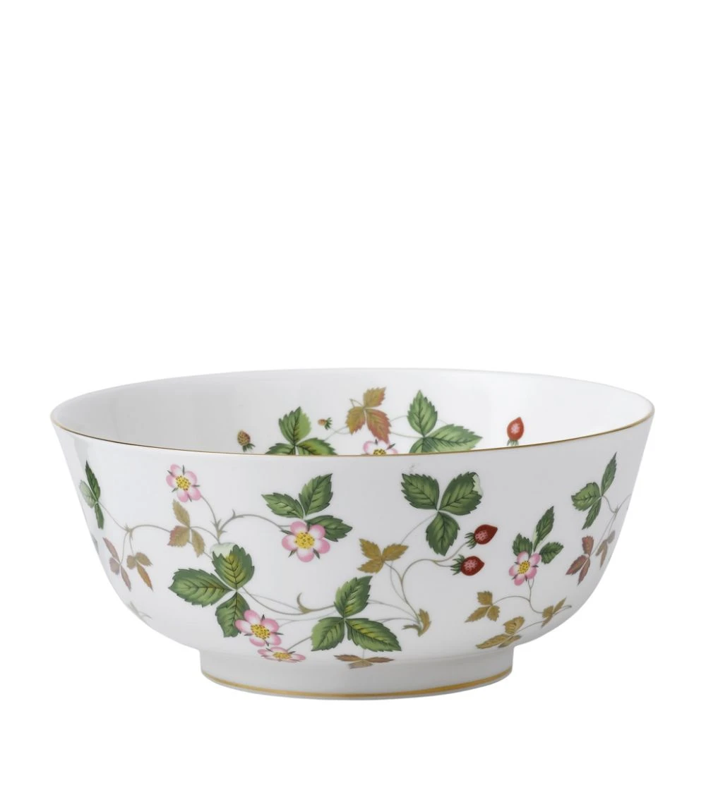 A charming love letter to the English countryside, Wedgwoods Wild Strawberry collection celebrates the humble strawberry with hand-decorated leaves and flowers and lustrous 22-karat gold detailing. Adding instant elegance to the dining room, this deep salad bowl is a charming serving piece for all seasons.