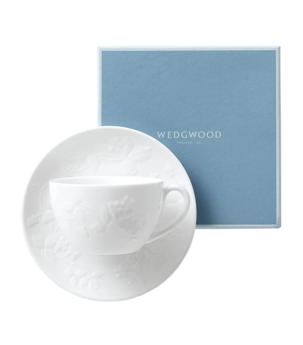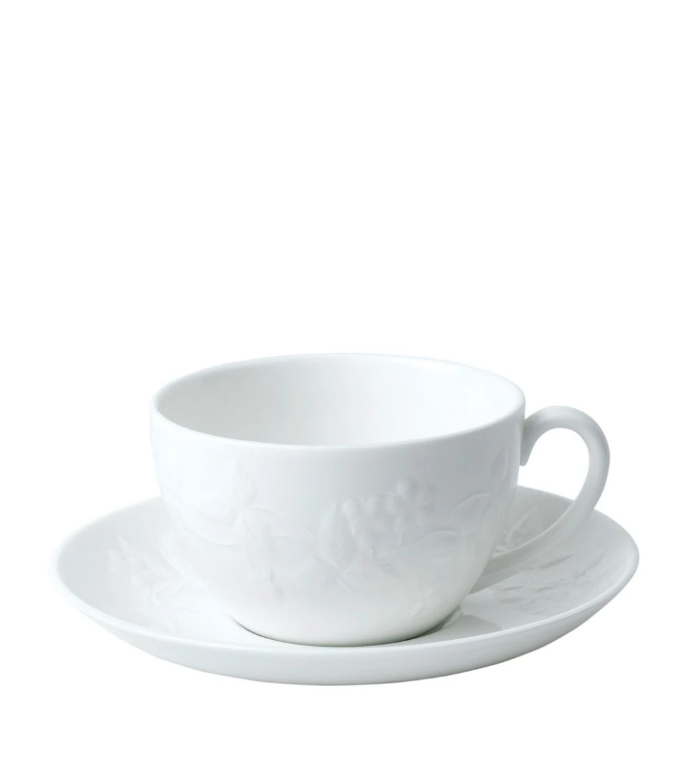 A charming love letter to the English countryside, Wedgwood’s Wild Strawberry White collection celebrates the humble strawberry with hand-decorated leaves and flowers and lustrous 22-karat gold detailing. Adding instant elegance to any dining occasion, this teacup and saucer is at once whimsical and chic.